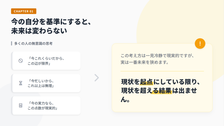 この考え方は一見冷静で現実的に思えるものの、実は未来の可能性を最も狭めています。理由はシンプルです。今の自分の延長線上にしか未来を置いていないからです。