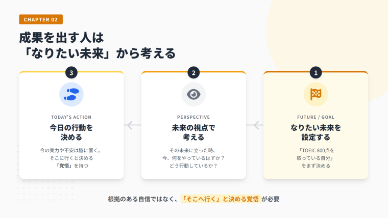 TOEICであれば、まず「800点を取っている自分」という未来を設定します。この未来に立ったときに、今どんな行動をしているはずかを考え、その視点で今日の行動を決めていきます。