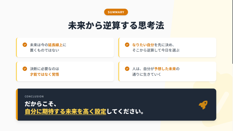なりたい自分を先に決め、そこから逆算して今日の行動を選び取る。